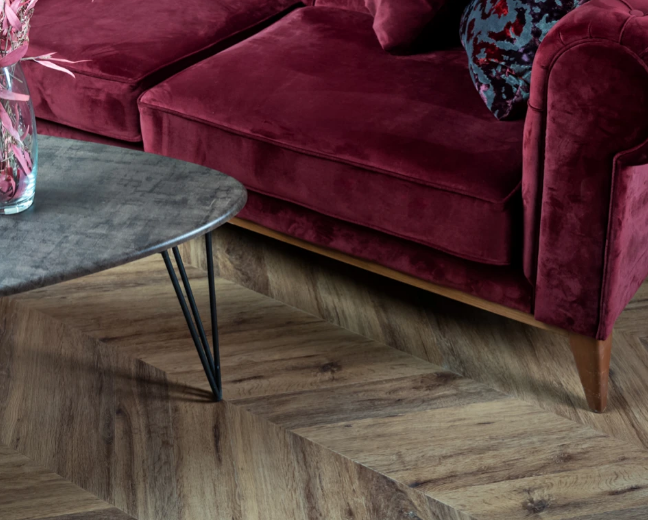 Parquet Chevron - коллекция предназначена для укладки бесклеевым способом узором французской елки. Формат планок у коллекции. Сами панели имеют форму параллелограмма с углом в 45°, доски разделяются на левые и правые. Такая форма, с одной стороны, полностью имитирует укладку французской елки без несовмещаемых углов, как у других вариантов. С другой стороны, размер панелей делает соединение прочным — значительно ниже риск расхождения замков, чем у мелкоформатных виниловых плиток. Также на прочность соединения влияет и внушительная толщина плит — замки выдерживают большую нагрузку, чем тонкие модели.